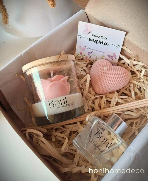 El box de regalo contiene una vela de rosa en vaso de vidrio con tapa de madera, una vela con forma de corazón y un difusor de vidrio con esencia a flores blanca y varilla de ratán.